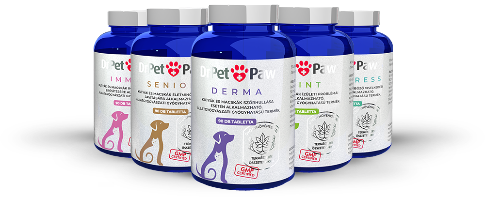 Gyógynövényes táplálékkiegészítők a kutyák és macskák egészségének támogatására, állategészségügyi háttérrel fejlesztve.